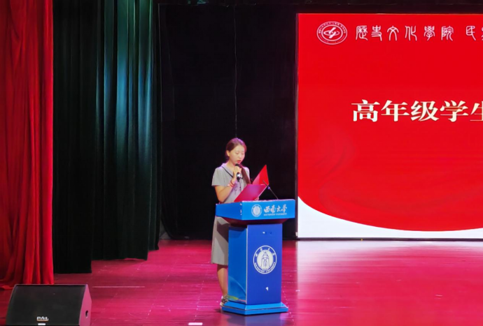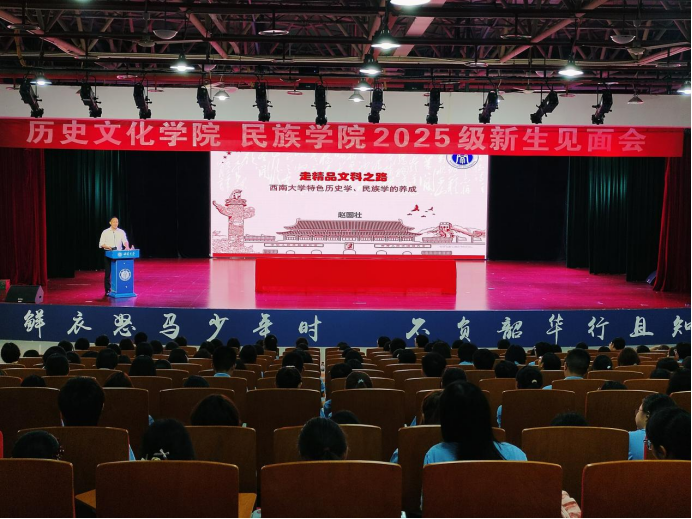 民族学院院长赵国壮教授以《走精品文科之路-西南大学特色历史学、民族学的养成》为题为全体新生讲授“开学第一讲”。他用一首今年暑期学院社会实践队原创的《烽火白沙》歌曲导入,图文并茂、生动形象地介绍了学院的历史发展沿革以及5大特色科研团队,包括冷门绝学研究、中希文明互鉴研究、长江中上游历史地理研究、中国抗战大后方研究、西南少数民族历史研究,最后他强调:历史研究是一切社会科学的基础。勉励同学们把握学习机会、潜心向学、赓续文脉、担当时代重任。“开学第一讲”让新同学们对学院学科专业有了初步了解和兴趣,建立起专业认同感和荣誉感。