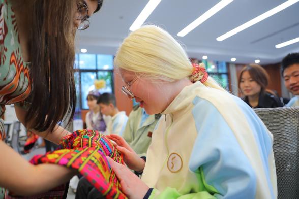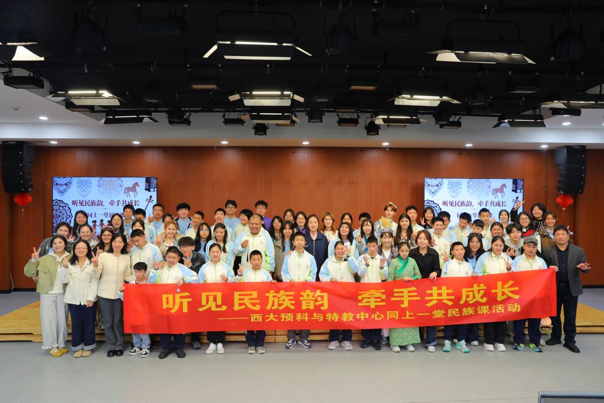 为深入推进大中小学思政课一体化建设,努力打造“民族文化+思政”少数民族预科特色活动品牌,2025年11月7日,西南大学2025级少数民族预科学生来到重庆市特殊教育中心,与一群“特殊的孩子”—视障青少年同上一堂民族文化课。本次活动以“听见民族韵牵手共成长”为主题,通过“听”“触”“品”“投”等沉浸式民族文化体验的形式,引导孩子们在互动中感悟中华民族文化魅力,进一步厚植中华民族共同体意识,成为校际协同推进思政教育的生动实践。