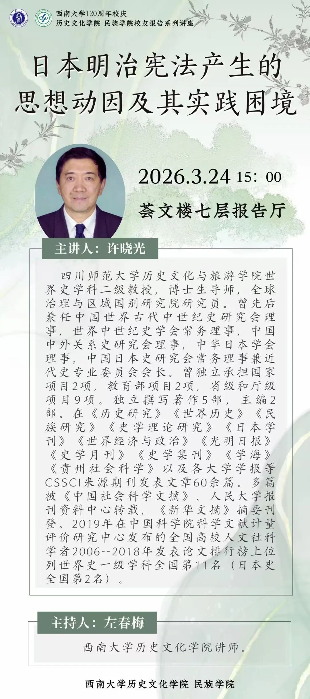 许晓光,四川师范大学历史文化与旅游学院世界史学科二级教授,博士生导师,全球治理与区域国别研究院研究员。曾先后兼任中国世界古代中世纪史研究会理事,世界中世纪史学会常务理事,中国中外关系史研究会理事,中华日本学会理事,中国日本史研究会常务理事兼近代史专业委员会会长。曾独立承担国家项目2项,教育部项目2项,省级和厅级项目9项。独立撰写著作5部,主编2部。在《历史研究》《世界历史》《民族研究》《史学理论研究》《日本学刊》《世界经济与政治》《光明日报》《史学月刊》《史学集刊》《学海》《贵州社会科学》以及各大学学报等CSSCI来源期刊发表文章60余篇。多篇被《中国社会科学文摘》、人民大学报刊资料中心转载,《新华文摘》摘要刊登。2019年在中国科学院科学文献计量评价研究中心发布的全国高校人文社科学者2006--2018年发表论文排行榜上位列世界史一级学科全国第11名(日本史全国第2名)。